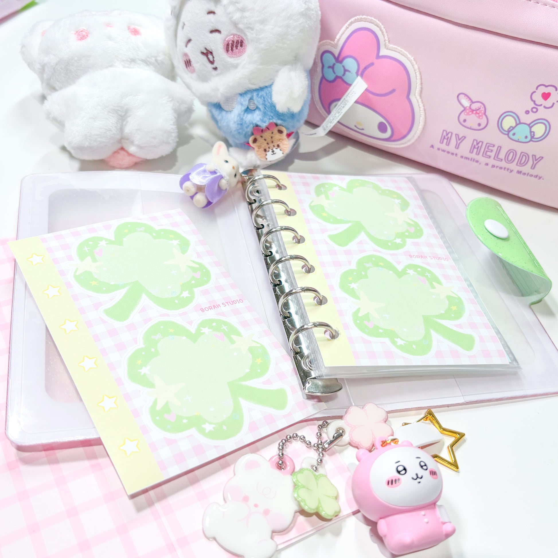 Transform you journal spreads, daily diary entrees and more with the help of Borah Studio's A7 Clover Memo Sticker Sheet! Featuring the prettiest character stickers, these are perfect for customizing and adding small accents to your notebooks and diary spreads! Get creative and enjoy the extra charm Borah Studio's A7 Clover Sticker Sheets brings to your collection!