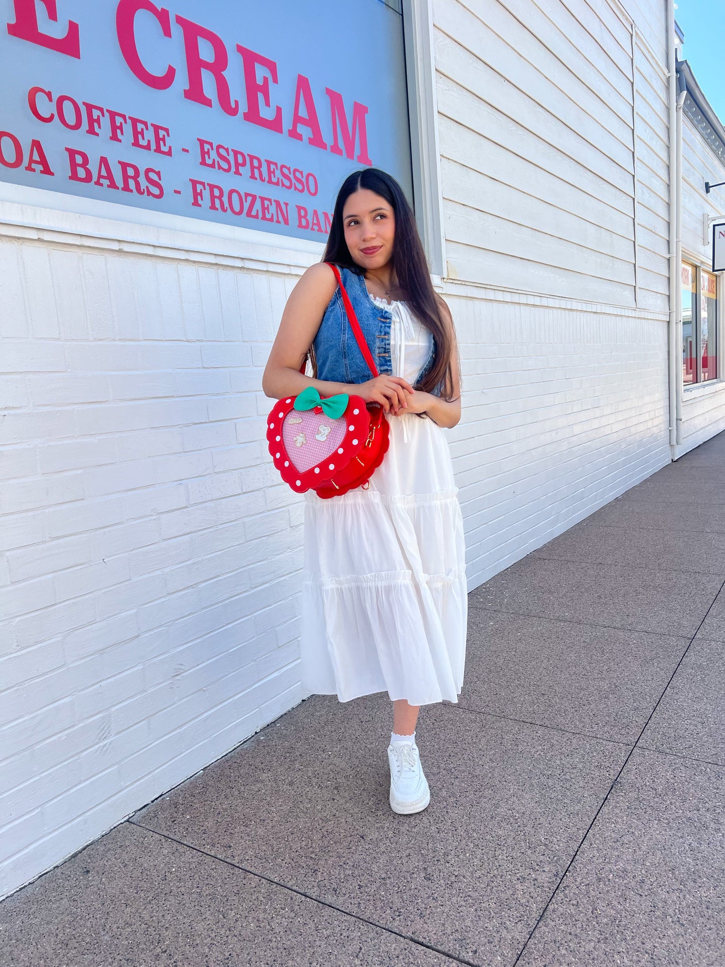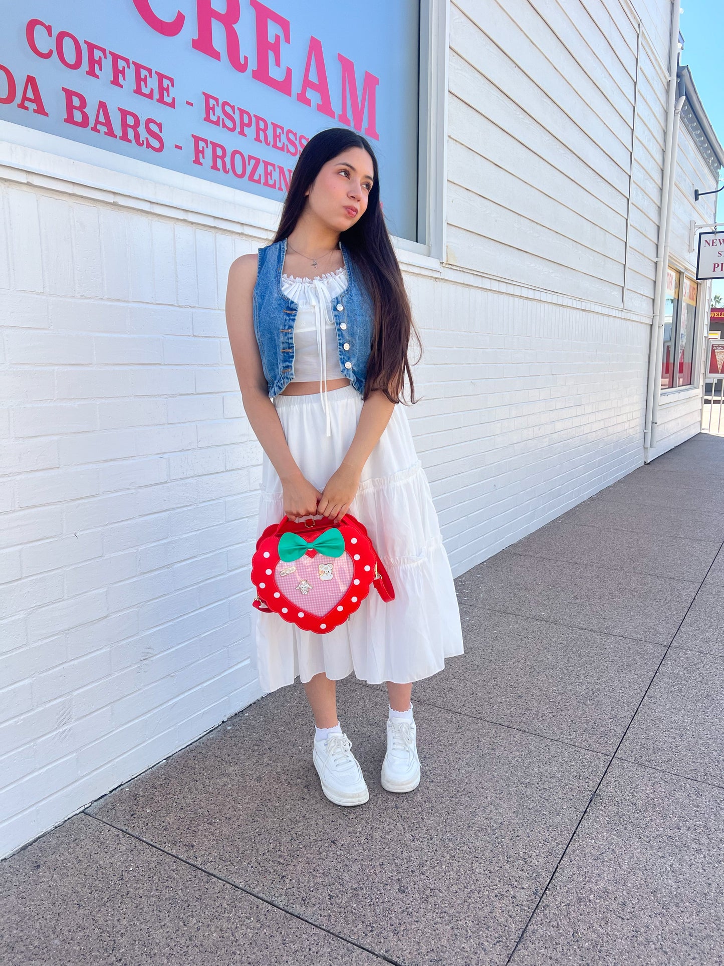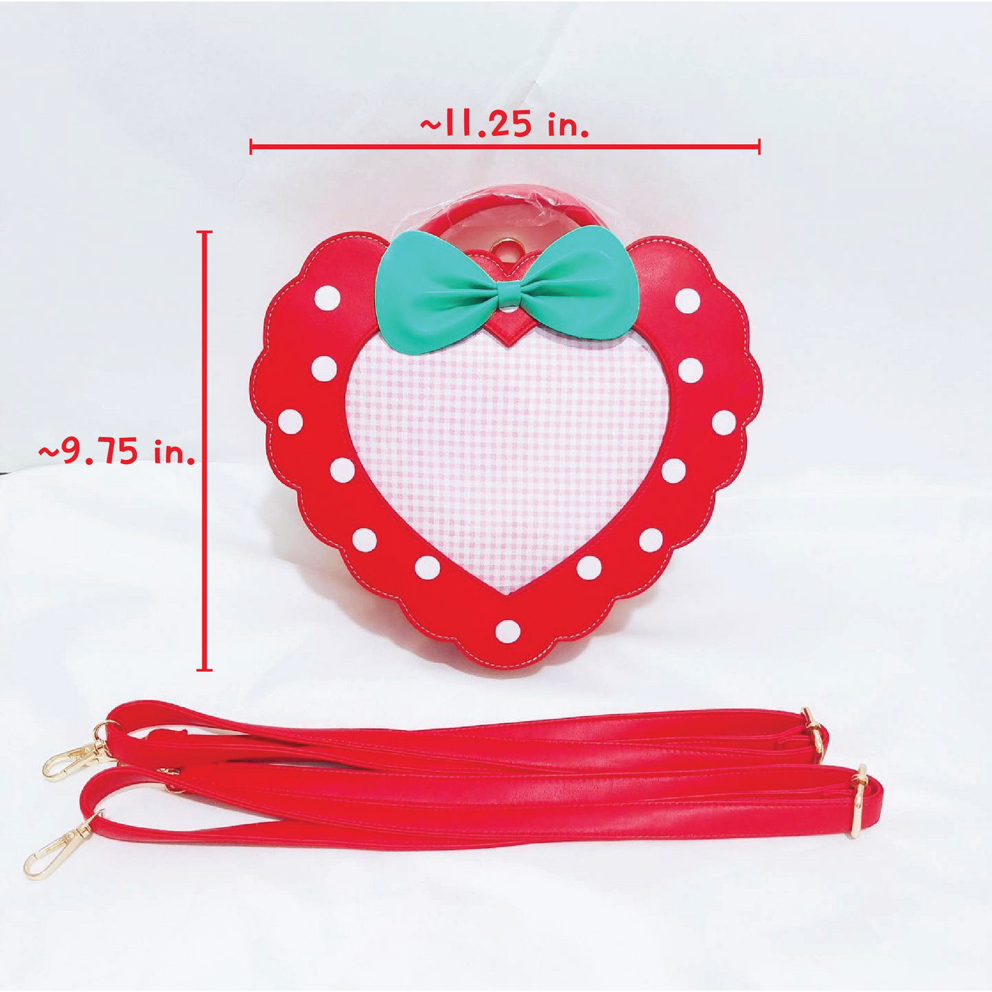 Feel cute and stylish with the Strawberry Heart Ita Bag! The perfect daily bag for your bright everyday look, it's designed to store your pins, makeup, school supplies, and more! Showcase your personality and style with this adorable bag!